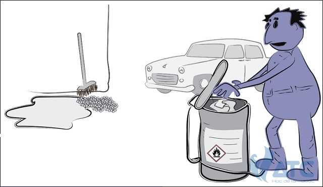 - Lau sạch vết dầu loang, dọn dẹp bộ lọc dầu, vải vụn và giấy đã sử dụng, cất trong thùng chống cháy, ví dụ như thùng kim loại có nắp đậy.