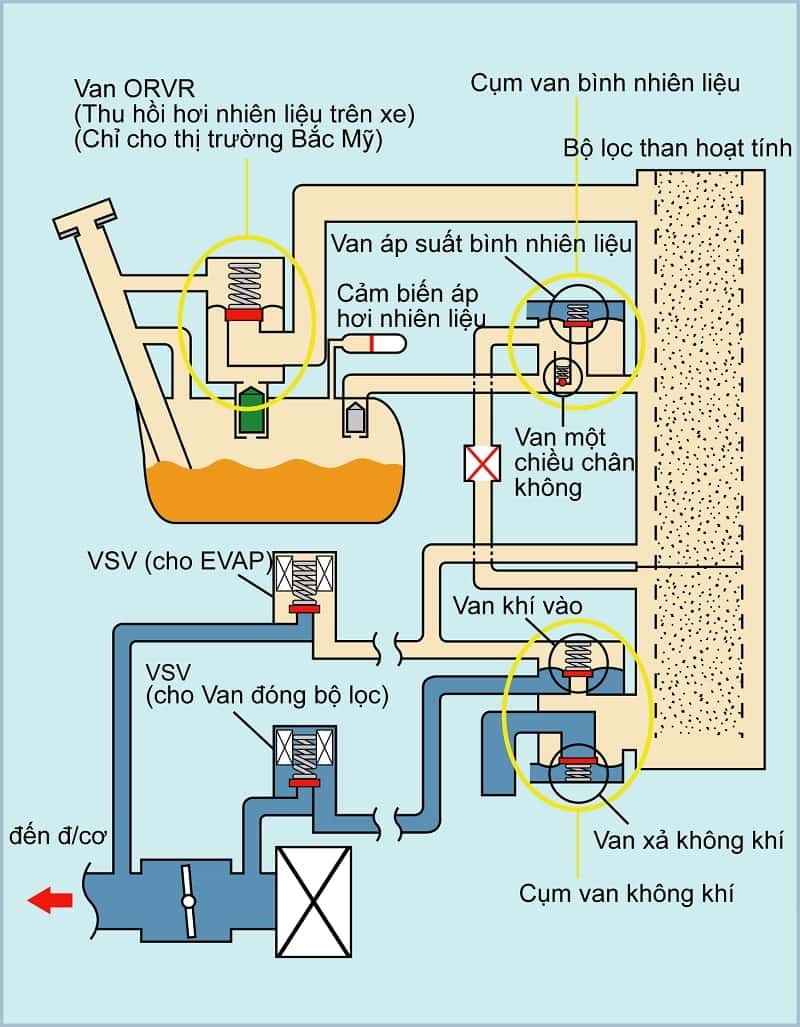 Để ngăn chặn lượng khí thải HC thoát ra ngoài môi trường, các van được trang bị sẽ kiểm soát lượng khí di chuyển vào bầu lọc chứa than hoạt tính.