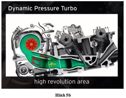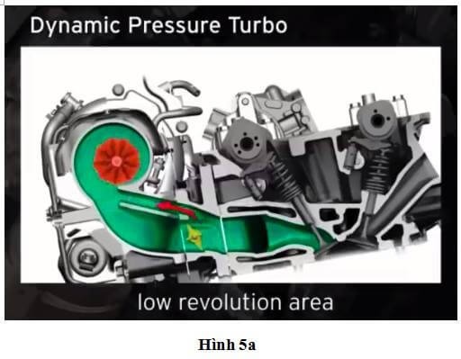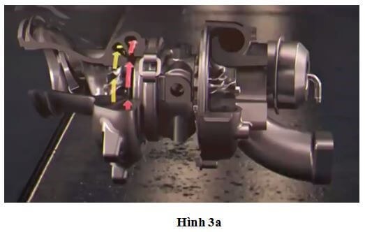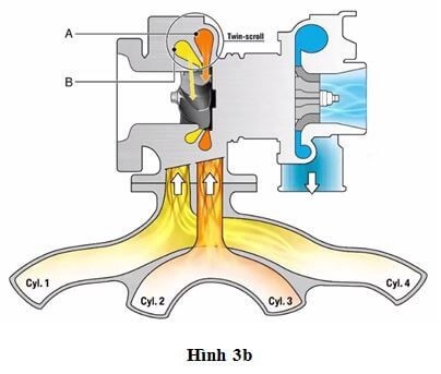 Khi số vòng quay máy thấp, van điều khiển đóng đường dẫn lớn, khí thải đi qua đường dẫn nhỏ, làm tăng tốc độ dòng khí thải, nghĩa là tăng tốc độ turbo, làm gảm độ trễ turbo (tham khảo hình 5a). Khi số vòng quay máy cao, van điều khiển mở ra, khí thải sẽ đi qua cả 2 đường dẫn, làm tăng lưu lượng dòng khí thải qua turbo xe ô tô, giúp làm tăng áp suất nén (tham khảo hình 5b).