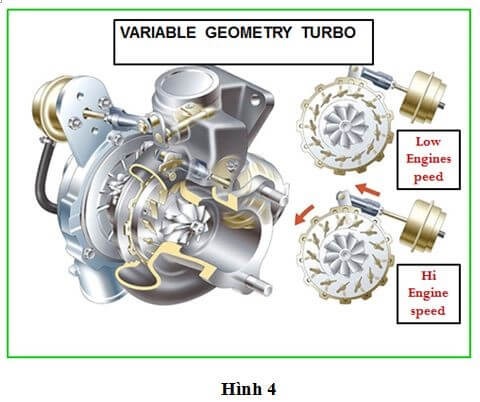 Công nghệ VGT sử dụng các van xếp hình vòng tròn bao quanh cánh tua bin và có thể thay đổi góc nghiêng cánh van. Khi ở vòng quay máy thấp, các cánh van khép lại giúp tăng tốc độ dòng khí thải, đồng nghĩa việc làm tăng tốc độ turbo xe ô tô, qua đó làm giảm độ trễ turbo. Khi ở vòng quay máy cao, các cánh van mở ra làm tăng lưu lượng dòng khí thải qua turbo, giúp tăng áp suất nén turbo (tham khảo hình 4).