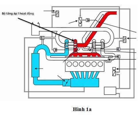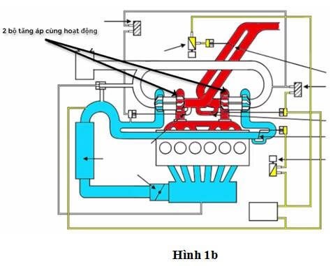 Khi số vòng quay máy cao, bộ turbo xe ô tô thứ 2 sẽ được vận hành. Lúc này khí thải được chia đều cho cả 2 turbo nên lưu lượng khí thải tăng để tăng hiệu suất khí nạp tối đa (tham khảo hình 1b).