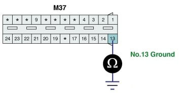 Kiểm tra lỗi điện áp túi khí thấp, chúng ta tiếp tục thực hiện Off chìa, tháo cọc âm bình ắc quy và đợi trong khoảng hơn 1 phút. Thực hiện tháo giắc của hộp túi khí sau đó đo điện trở ở chân thứ 13 (hình dưới) của hộp túi khí và mát, thông số điện trở chuẩn sẽ nằm ở khoảng 1 ôm. Hai trường hợp xảy ra như sau: