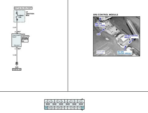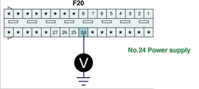 Thực hiện Off chìa, tháo cọc âm bình ắc quy và đợi trong khoảng hơn 1 phút. Thực hiện tháo giắc của hộp túi khí sau đó gắn cọc bình và cho nổ máy. Đo chân số 24 (hình dưới) của giắc hộp túi khí với mát điện áp, chúng cần phải đạt xấp xỉ 9 ≤ V batt ≤ 16. Sẽ tiếp tục có 2 trường hợp: