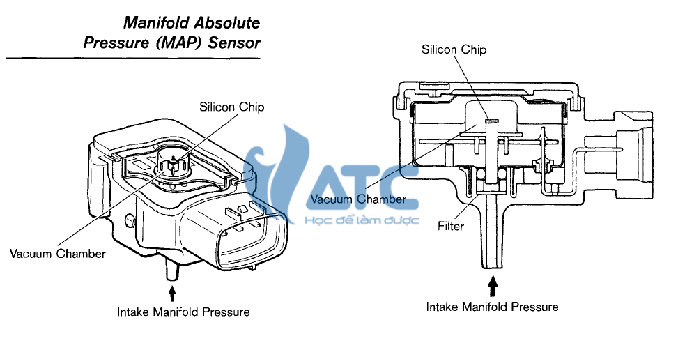 Cảm biến áp suất đường ống nạp (MAP- Manifold Absolute Pressure) có nguyên lý làm việc khá cơ bản. Khi động cơ hoạt động, độ chân không ở sau bướm ga được đưa đến màng silicon. Lúc này, màng silicon sẽ biến dạng và làm thay đổi điện trở của màng silicon.