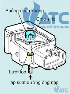Cảm biến áp suất đường ống nạp được cấu tạo từ một buồng chân không, màng silicon, một con chíp silic (IC), lưới lọc, đường ống dẫn và giắc cắm.