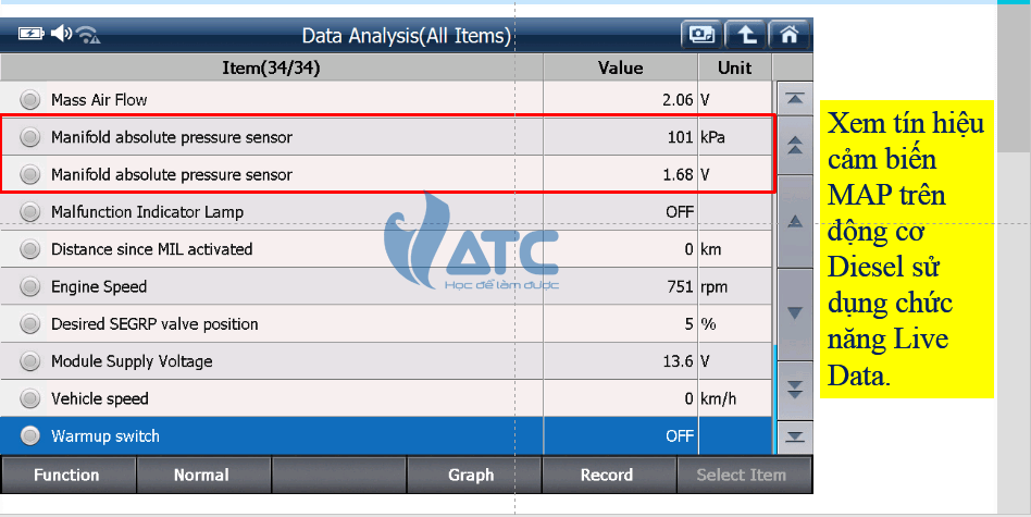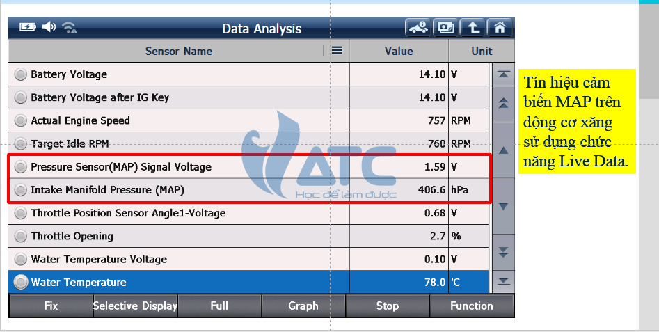 Nhìn vào dữ liệu của cảm biến trên màn hình máy chẩn đoán có thể phân tích được nhiều bệnh liên quan tới áp suất đường ống nạp như hiện tượng bị hở cổ hút, hay hiện tượng hở van EGR.