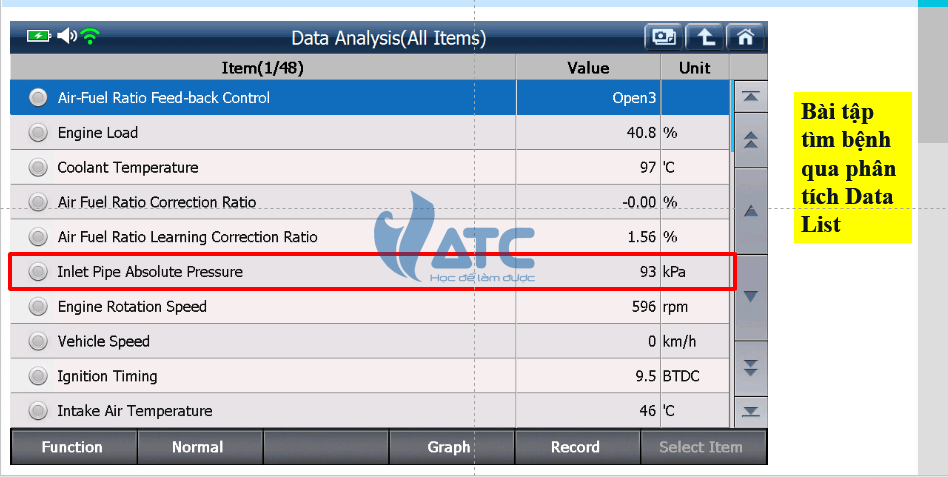 – Cũng có thể sử dụng máy đọc lỗi vào data list để xem tín hiệu cảm biến khi đạp ga, tín hiệu cảm biến phải thay đổi.