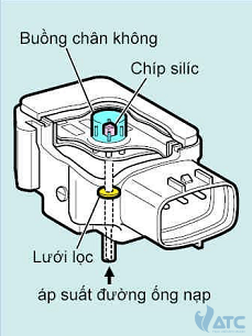 Cảm biến áp suất đường ống nạp được cấu tạo từ một buồng chân không có gắn một con chip silicon, lưới lọc, đường ống dẫn và giắc cắm.