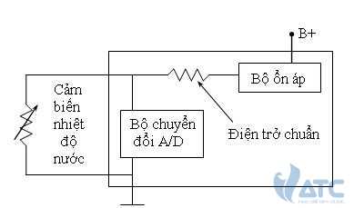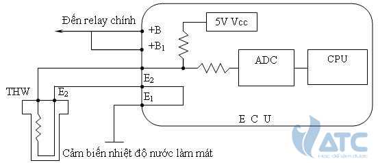 Điện áp 5V qua điện trở chuẩn (điện trở này có giá trị không đổi theo nhiệt độ) đến cảm biến rồi trở về ECU về mass. Như vậy điện trở chuẩn và nhiệt điện trở trong cảm biến tạo thành một cầu phân áp. Điện áp điểm giữa cầu được đưa đến bộ chuyển đổi tín hiệu tương tự – số (bộ chuyển đổi ADC – Analog to Digital converter).