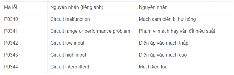 Các mã lỗi thường thấy khi cảm biến vị trí trục cam bị hư hỏng như sau: