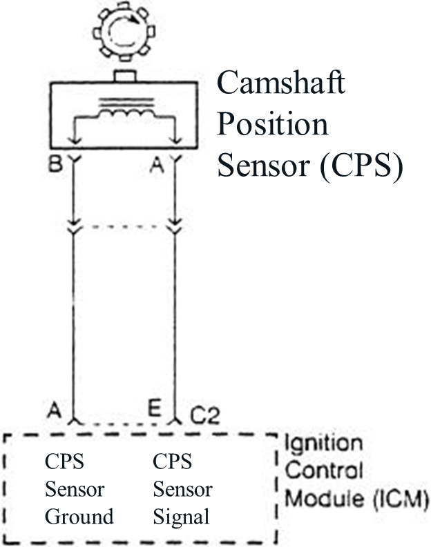 Mạch điện cảm biến trục cam loại điện từ (2 dây, không cần nguồn cấp), có những xe đời mới sử dụng thêm 1 dây nối mass bọc xung quanh 2 dây tín hiệu để chống nhiễu tín hiệu.