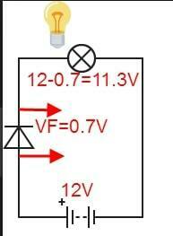 Như vậy có nghĩa là bóng đèn không được cấp trực tiếp một nguồn điện 12V, mà chỉ có 11.3V do Diode đã tạo ra một sụt áp 0.7V. Đây là một điểm bất lợi khi dòng điện qua tải lớn, vì nó sinh ra một công suất tiêu tán trên chính Diode.