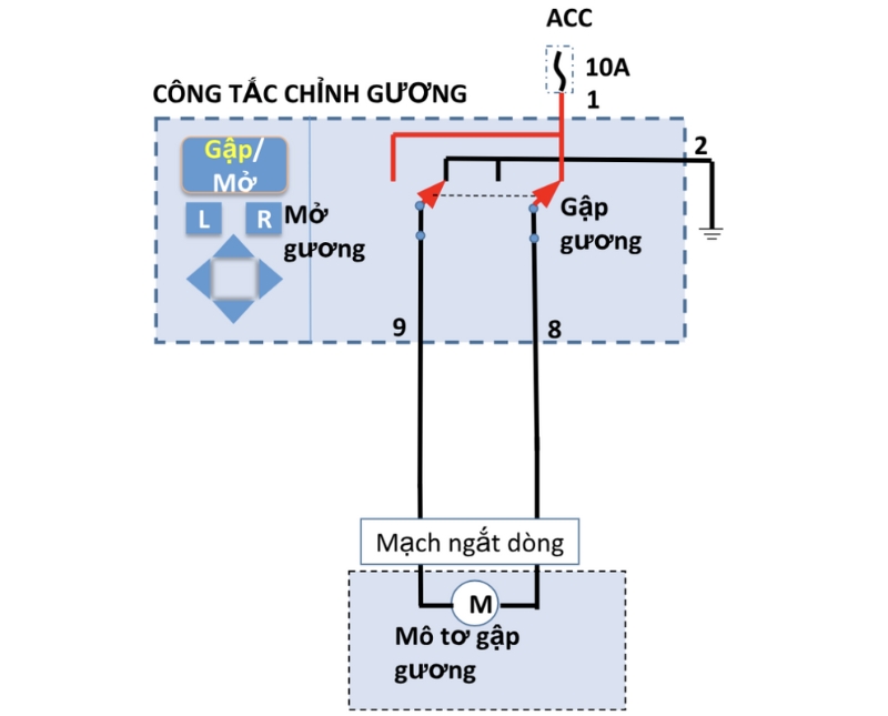 - Sơ đồ mạch điện hệ thống gập gương điện trên xe: