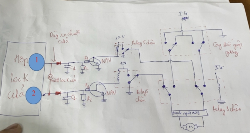 - Nhấn Lock cửa, chân số 1 của hộp BCM sẽ xuất dương, dòng điện sẽ chia thành 2 nhánh: 1 nhánh sẽ nạp cho tụ điện, nhánh còn lại sẽ đi và kích cho con TR1 hoạt động nhịp mass cho Relay 5 chân phía trên, Relay 5 chân phía trên hoạt động đổi tiếp điểm thường đóng nhảy sang trái, một đầu của mô tơ gập gương được nối dương đầu còn lại vẫn được nối mass tại tiếp điểm thường đóng của Relay 5 chân phía dưới. Mô tơ gập lại.