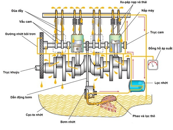 - Khi động cơ hoạt động, dầu từ cacte được bơm dầu bôi trơn ô tô hút qua các lọc dầu, qua ống dẫn đến bầu lọc thô vào ống dẫn dầu chính. Từ ống dẫn dầu chính, dầu sẽ theo các ống dẫn dầu nhánh đi bôi trơn cho cổ trục khuỷu, cổ trục cam, bạc cổ trục chính rồi qua lỗ và rãnh ở trong trục khuỷu (trục khuỷu rỗng) để bôi trơn bạc đầu to thanh truyền và các cổ trục còn lại của trục khuỷu.