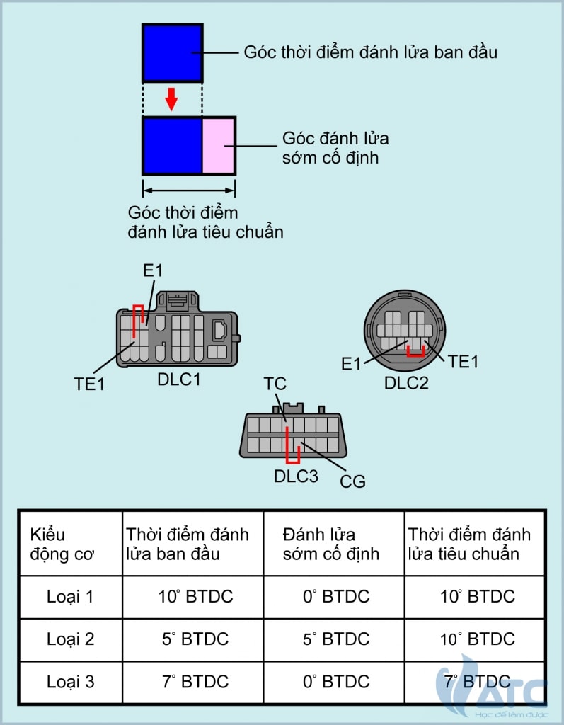 Tạo ra một ngắn mạch bằng cách nối tắt cực TE1 (TC) với E1 (CG) của giắc DLC1, DLC2, hoặc DLC3, và đặt thời điểm đánh lửa tiêu chuẩn. Thời điểm đánh lửa tiêu chuẩn này khác nhau theo kiểu xe được thể hiện trong bảng ở bên trái. Vì vậy khi tiến hành việc điều chỉnh này, hãy tham khảo Sách hướng dẫn sửa chữa thích hợp.