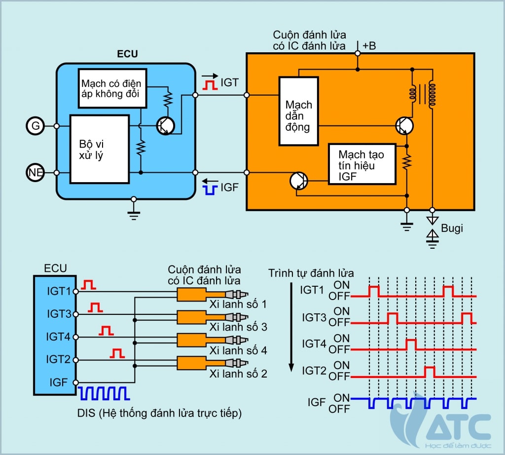 Đồng thời, tín hiệu IGF được gửi đến ECU động cơ: Hiện nay, mạch đánh lửa chủ yếu dùng loại DIS (hệ thống đánh lửa trực tiếp). ECU động cơ phân phối dòng điện cao áp đến các xi lanh bằng cách gửi từng tín hiệu IGT đến các IC đánh lửa theo trình tự đánh lửa. Điều này làm cho nó có thể tạo ra việc điều chỉnh thời điểm đánh lửa có độ chính xác cao.