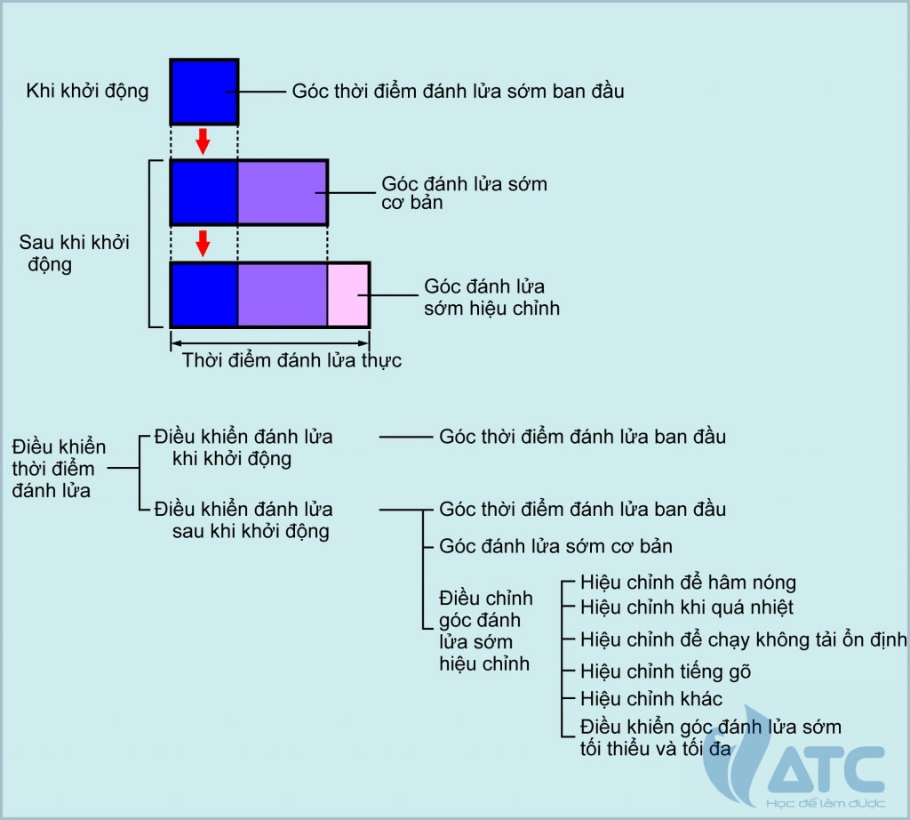 - Việc điều chỉnh này được thực hiện bằng cách tiến hành các hiệu chỉnh khác nhau đối với góc thời điểm đánh lửa ban đầu và góc đánh lửa sớm cơ bản.