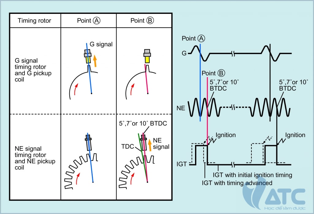 Khi ECU động cơ nhận được tín hiệu NE (điểm B), sau khi nhận tín hiệu G (điểm A), ECU xác định rằng đây là góc thời điểm đánh lửa ban đầu khi trục khuỷu đạt đến 5 ° , 7 °, hoặc 10 ° BTDC (khác nhau giữa các kiểu động cơ).