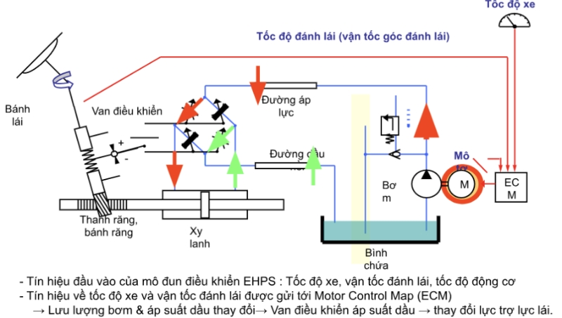 - Vì hệ thống lái trợ lực điện- thủy lực điều khiển tốc độ mô tơ lái nên lực đánh lái được kiểm soát và người ta gọi hệ thống điều khiển này là “kiểu điều khiển theo dòng”.