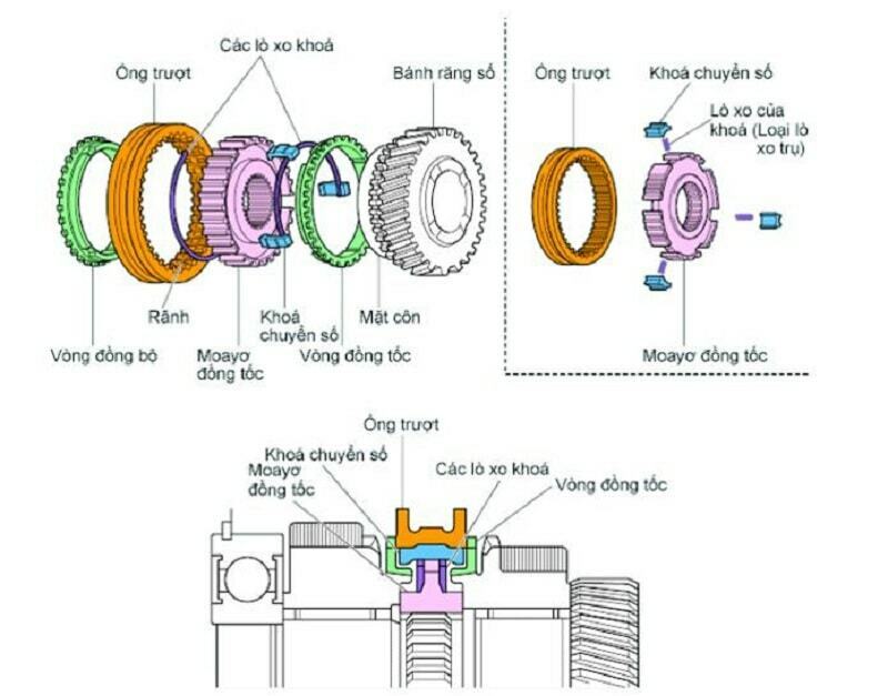 5. Bộ đồng tốc: Ngăn chặn sự trèo răng trong quá trình vào khớp. Khóa bánh răng thứ cấp vào trục thứ cấp. Bộ đồng có tác dụng làm đồng đều tốc độ của các bánh răng khi gài số, loại bỏ tình trạng va đạp giữa các bánh răng, giúp quá trình gài số trở nên dễ dàng, êm dịu và không xuất hiện tiếng động.
