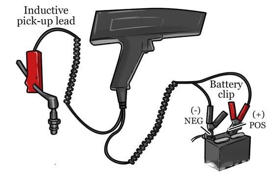 Bạn hãy gắn 2 kẹp màu đen và đỏ lên cực âm và dương của bình ắc quy, kẹp còn lại bạn hãy gắn lên dây cao áp của máy số 1. Sau đó bạn hãy kiểm tra thông số góc đánh lửa trên puli trục khuỷu. Tiếp đến bạn hãy so sánh thông số đó với thông số được ghi trong sách hướng dẫn sửa chữa, nếu tỉ lệ không giống nhau, bạn hãy điều chỉnh lại góc đánh lửa để giúp động cơ đạt được công suất tốt nhất.