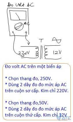 * Thang đo volt AC: Khi Bạn đo volt AC Bạn đặt nút xoay trên các thang đo AC. Với các mức volt AC chưa biết, Bạn nên khởi đầu ở các thang đo vot AC lớn. Bạn nhớ kết quả đo volt AC chỉ chính xác khi: (1) Trên điểm đo không chứa thành phần phân cực DC, (2) Tín hiệu đo phải có dạng sin và ở tần số là 50Hz. Khi không thỏa 2 điều kiện này, phép đo volt AC của VOM sẽ không chính xác, chỉ mang tính định tính hơn là định lượng. bạn cũng nên nhớ người ta chia vạch volt AC theo mức áp hiệu dụng.