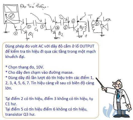 Hình vẽ này cho thấy cách dùng máy đo Volt AC, thang đo thấp, với dây đỏ cắm ở lỗ OUTPUT để kiểm tra tín hiệu xuất hiện trong một mạch khuếch đại. Chúng ta biết, trong một mạch điện, tín hiệu là sự nhấp nhô lên xuống của mức volt trên mức Volt phân cực DC. Tín hiệu AC trong mạch luôn có điểm khởi phát và làn dần đến tải. Nếu đã nắm được đường đi của tín hiệu trong một mạch điện, chúng ta dễ dàng dùng Volt kế AC để “xác nhận sự có mặt của tín hiệu trên các điểm này”. Nếu đo tại điểm 4, kim lên là có tín hiệu và chuyển qua đo tại điểm 5, kim không lên là không có tín hiệu, vậy tụ liên lạc C2 hư hay có hở mạch. Nói cho cùng sửa máy là làm công việc tìm xem tín hiệu bị mất ở điểm nào, mất do lý do vì, nếu do linh kiện hư thay cái mới vào là xong, nếu do đứt mạch, hàn lại là được…Do vậy nếu biết dùng phép đo này, việc tìm chổ hỏng trong các thiết bị điện tử cũng không phải là công việc quá khó.