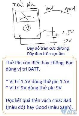 Thử pin là kiểm tra xem nguồn Pin có còn nhiều điện năng hay đã hết. Muốn vậy người ta dùngphép đo Volt DC có mang tải. Khi Pin yếu, lúc đo Volt DC không tải, chúng ta vẫn thấy có đủ Volt, nhưng khi cho pin mang tải thì sẽ thấy “mất Volt”. Với Pin người ta dùng vạch chia màu xanh ghi là Good, pin còn đủ mạnh, vạch chia màu đỏ ghi là Bad, pin đã yếu. Như vậy khi dùng phép đo Volt DC thông thường đo trên các pin, chúng ta không thể biết chính xác là pin còn mới hay đã dùng nhiều rồi, phải cho pin mang tải, khi mang tải mức áp sụt ít là pin tốt, nếu mức áp giảm mạnh là pin đã yếu.