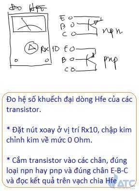 * Đo hệ số HFE: Với các transistor bipolar, loại transistor có 2 mối nối pn, như transistor pnp hay npn, tỷ số dòng IC trên dòng IB gọi là hệ số khuếch đại dòng ß hay HFE. Muốn đo hệ số khuếch đại dòng của các transistor. Bạn phải: (1) Đặt ở thang đo Ohm Rx10, chạm kim chỉnh kim về 0 Ohm. (2) Cắm transistor npn hay pnp vào đúng loại và cắm đúng chân và đọc kết quả trên vạch chia HFE. Điều Bạn cần nhớ: Máy đo này chỉ dùng đo HFE của các transistor công suất nhỏ.