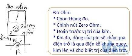 Khi đo Ohm, Bạn dùng nguồn điện năng của pin có trong máy đo, cho bơm dòng qua vật đo, dòng điện tử chảy ra trên dây màu đỏ và chảy vào trên dây màu đen, dòng điện này chảy qua vật đo, như: điện trở, cuộn dây… và chảy qua điện kế khung quay làm lệch kim. Bạn đọc kết quả trên vạch chia Ohm. Đo Ohm là kiểm tra trị của các điện trở, kiểm tra trị của các cuộn dây…. Khi đo, Bạn chọn thang đo cho phù hợp, chập cây đo chỉnh kim về vị trí 0 Ohm và rồi tiên đoán vị trí dừng của kim, khi đặt điện trở vào 2 dây đo, nếu kim dừng đúng vị trí chờ đợi là điện trở tốt, nếu kim không lên thì điện trở đã bị đứt. Với điện trở khi hư nó thường tăng Ohm hay đứt.