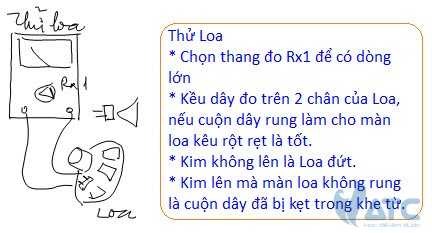 Cấu tạo của Loa gồm có một cuộn dây, quen gọi là cuộn coil, gắn dính trên màn Loa và người ta cho đặt cuộn dây nằm trong khe của một nam châm, do vậy khi Bạn cấp dòng điện cho cuộn dây nó sẽ có từ tính và tương tác với nam châm vĩnh cửu tạo ra lực hút hay lực đẩy. Khi thử Loa Bạn dùng Ohm kế lấy thang đo Rx1 để có dòng điện chảy trên dây đo lớn, cho dòng điện này kích thích cuộn dây, nó sẽ làm rung màn Loa và phát ra tiếng kêu rột rẹt là Loa tốt. Kim không lên là cuộn dây hay dây nối đã bị đứt, kim lên mà màn không rung là cuộn dây đã bị kẹt trong khe, đo Ohm cuộn dây và thành vỏ của Loa, kim lên là cuộn dây bị tróc lớp cách điện và đã chạm vào thành Loa.