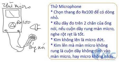 Muốn kiểm tra các ống nói kiểu điện động có còn tốt hay không, Bạn cũng “mượn dòng điện” của một Ohm kế cho kích thích cuộn dây nằm trong ống nói, khi cuộn dây này rung Bạn sẽ thấy kim lên và nghe tiếng rột rẹt. Điều cần nhớ là phải thấy thang đo Ohm lớn, như: Rx10 hay Rx100, để có dòng điện nhỏ, lấy dòng quá lớn có thể làm hư ống nói điện động. Bạn nhớ, nếu kích ống nói với dòng điện đủ nhỏ mà màn micro vẫn rung được là loại microphone có độ nhậy tốt.