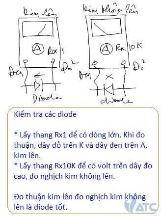 Với các diode, Bạn có thể dùng Ohm kế đo tính thuận nghịch để biết diode có còn tốt hay không. Khi đo thuận, lấy thang đo Rx1 để có dòng điện trên dây đo lớn. Chập kim chỉnh về 0 Ohm, và khi đo kim sẽ lên. Lúc này Bạn đọc kết quả trên vạch chia LI và LV để biết mức áp ghim trên diode. Nếu mức áp ghim là 0.6V là loại diode Si bình thường, nếu mức áp ghim là 0.2V đó là diode Schottky dùng ở các mạch điện có volt thấp. Khi đo nghịch, Bạn nên dùng thang Rx10K để có mức volt trên dây đo cao, đo nghịch kim phải không lên. Khi thử nhanh, Bạn chỉ cần chú ý: Đo thuận kim lên, đo nghịch kim không lên. 2 lần đo kim đều lên là diode chạm và 2 lần đo kim đều không lên là diode đứt.
