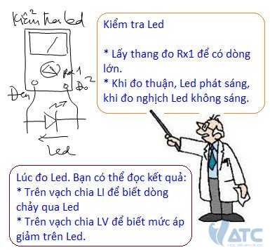 Kiểm tra các Led. Vì Led cũng là diode, nên khi kiểm tra các Led cũng đo như các diode. Khi đo thuận, kim lên và Led sáng và khi đo nghịch kim không lên và Led không sáng. Bạn nhớ: Khi đo theo chiều thuận, ở thang đo Rx1 có dòng trên dây đo lớn, Bạn hãy xem kết quả trên vạch chia LV sẽ biết được mức ghim áp trên Led. Các Led thường có mức ghim áp trên dưới 2V, với các Led siêu sáng có mức ghim áp khoảng 3V. Khi đo thuận, Led không sáng là Led hư.
