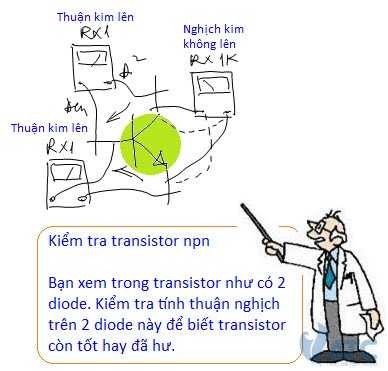 Transistor bipolar (2 mối nối) có 2 dạng: dạng pnp và dạng npn. Do mối nối pn là cấu tạo của một diode, nên transistor bipolar có thể xem như có 2 diode, diode ở chân BE và diode ở chân CB. Vậy muốn biết một transistor có tốt hay không, Bạn kiểm tra nhanh 2 diode này. Đo thuận nghịch diode BE và diode CB, nếu cả 2 diode này đều tốt là transistor tốt. Bạn nhớ: diode CB có mức áp đánh thủng thường rất cao, nên ở thang đo Rx10K, tuy mức áp trên máy đo Ohm là 12V kim cũng không lên, nhưng diode BE có mức áp đánh thủng thường thấp khoảng 10V, nên khi đo nghịch trên diode này, kim sẽ vẫn lên, lên ít vì dòng nhỏ. Chúng ta dùng đặc tính này của transistor để tìm ra chân E và chân C sau khi đã tìm ra chân B.