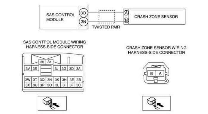 Nếu không có điện áp bằng 0V thì hãy xác nhận xem có kết nối chung giữa các chân giắc hộp SAS với cảm biến va chạm hay không?. Nếu có 1 kết nối chung thì xác định hư hỏng bằng cách kiểm tra kết nối chung và chân giắc xem có bị ăn mòn/hỏng và bó dây điện chung bị ngắn mạch đến nguồn dương. Nếu không có kết nối chung thì thay dây điện ngắn mạch đến nguồn cấp dương rồi tới bước 5.