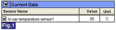 Thực hiện bật ON chìa rồi kết nối GDS với xe và chọn mục Data Analysis > Current data > Giám sát thông số In-car temperature sensor 1. Kiểm tra xe cảm biến nhiệt độ trên xe có đang hoạt động bình thường hay không. (Thông số In-car temperature sensor 1 sẽ đạt 25◦C (77◦F)).