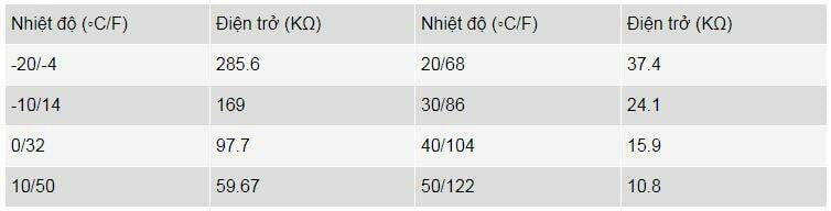 Các bạn cùng VATC tham khảo bảng thông số tiêu chuẩn và vị trị của cảm biến nhiệt độ trên xe: