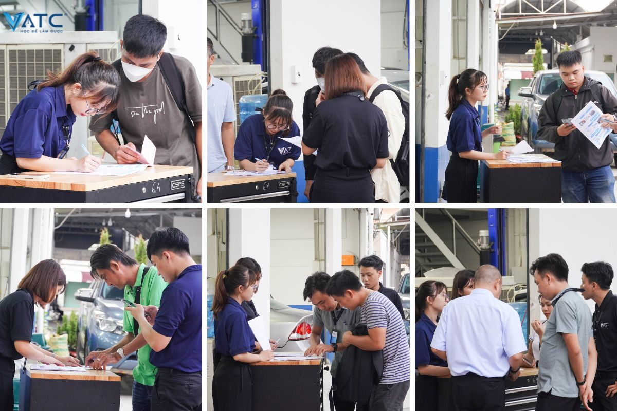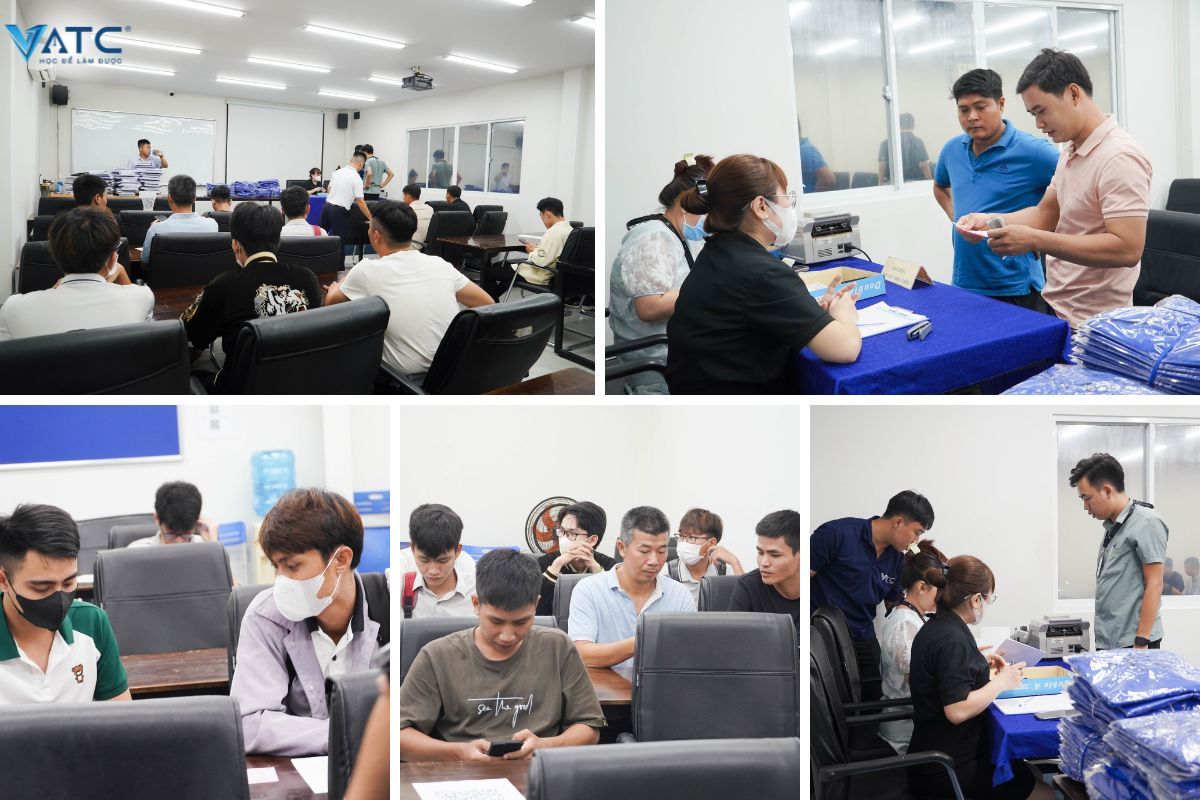 Sau khi được hướng dẫn check in, học viên sẽ lên phòng làm thủ tục nhập học và di chuyển qua phòng để tiến hành làm lễ khai giảng. Buổi học đầu tiên cũng được bắt đầu ngay sau đó dưới sự giảng dạy của thầy Nguyễn Đình Thống – Giám đốc Đào Tạo VATC.