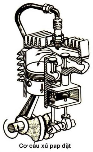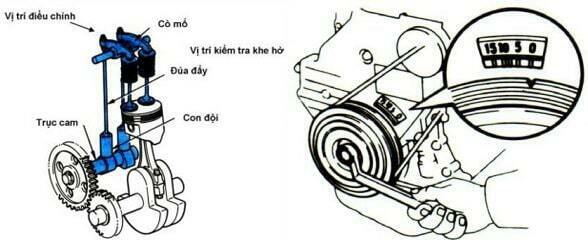 – Cơ cấu OHV, khe hở hiệu chỉnh nằm giữa đuôi xupap và đầu cò mổ, vít hiệu chỉnh ở trên đuôi cò mổ.
