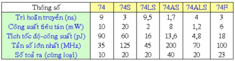 Bảng sau so sánh một số thông số chất lượng của các loại TTL kể trên.
