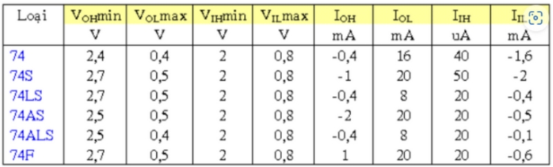 Còn bảng dưới đây tóm tắt các thông số điện thế và dòng điện ở ngõ vào và ngõ ra của các loại TTL kể trên.