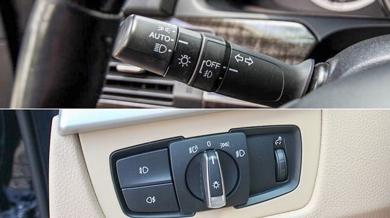 Các hãng sản xuất xe thường lắp đặt cụm công tắc đèn pha ô tô ở vị trí bên trái vô lăng, và sẽ tích hợp thêm các công tắc điều khiển đèn khác. Hệ thống đèn tự động sẽ được trang bị thêm một cảm biến quang, cảm biến này được gắn sát mép bên dưới kính chắn gió phía trước.