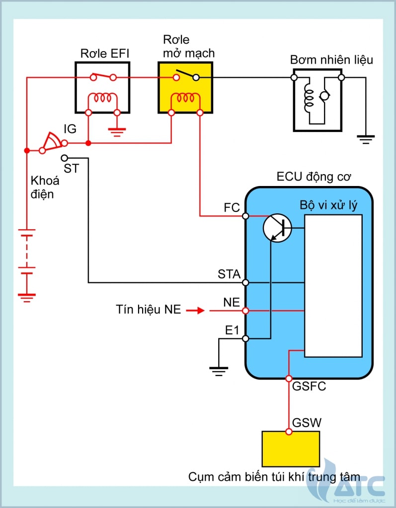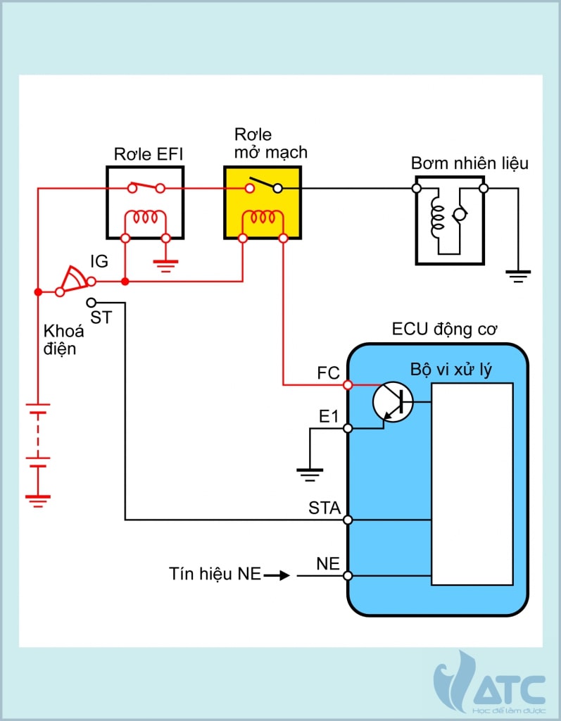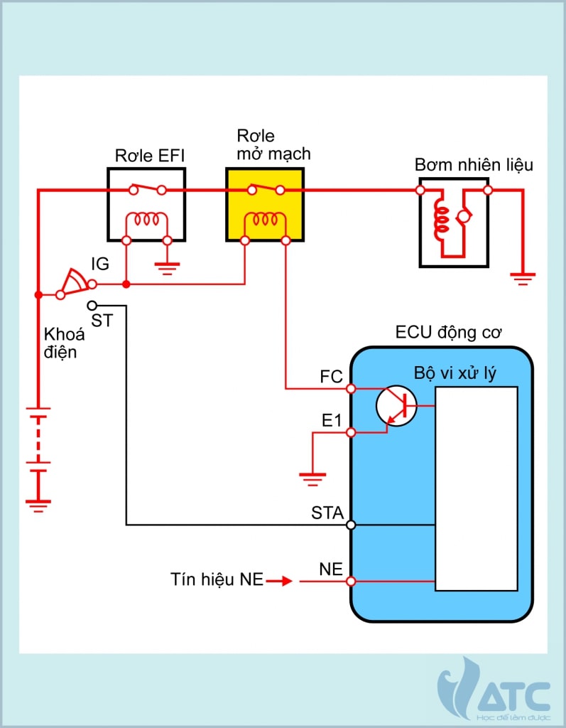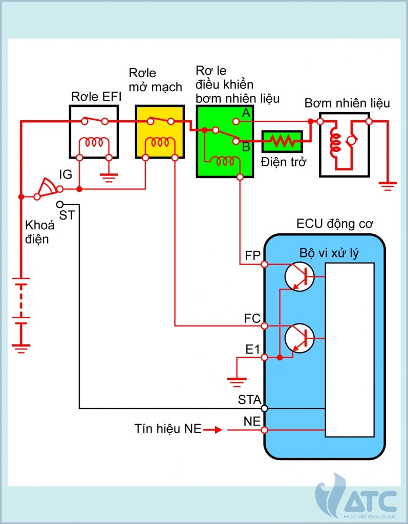Cùng một lúc khi động cơ quay khởi động, ECU động cơ nhận tín hiệu NE từ cảm biến vị trí của trục khuỷu, làm cho tranzito này tiếp tục duy trì hoạt động của bơm nhiên liệu.