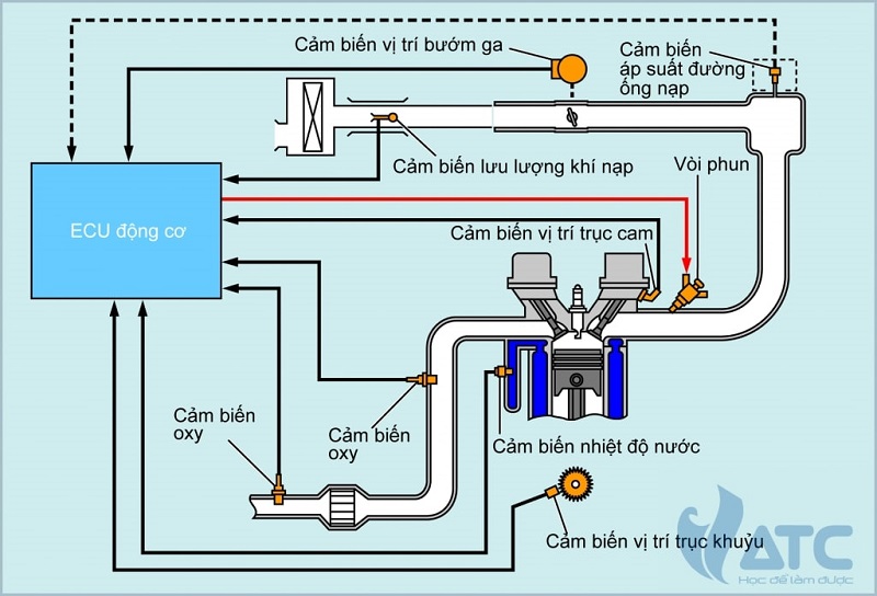 ECU này tính thời gian phun nhiên liệu tối ưu dựa vào các tín hiệu từ các cảm biến. - Cảm biến lưu lượng khí nạp hoặc cảm biến áp suất đường ống nạp