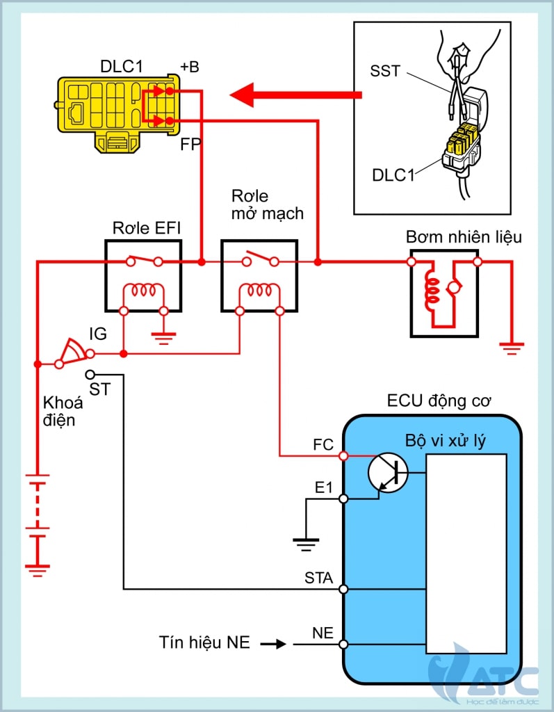 Khi nối tắt cực +B và cực FP của DLC1 bằng một SST với khoá điện bật ON, dòng điện sẽ chạy vào bơm nhiên liệu, không đi qua rơle mở mạch để điều khiển bơm nhiên liệu.