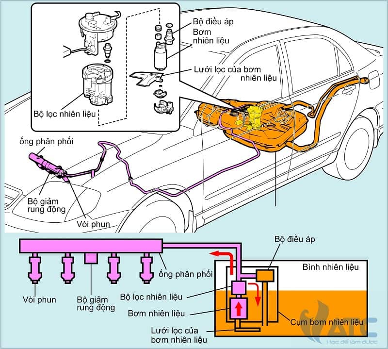 Nhiên liệu được lấy từ bình nhiên liệu bằng bơm nhiên liệu và được phun dưới áp suất bởi vòi phun.
