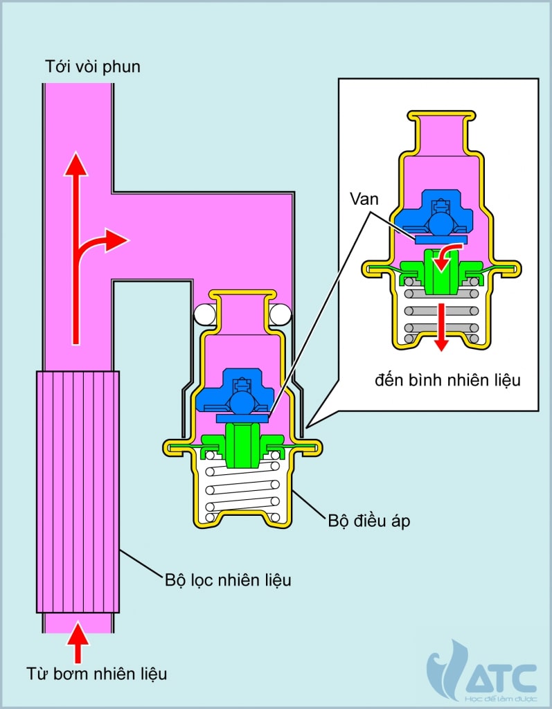 - Khi áp suất nhiên liệu vượt quá lực ép của lò xo trong bộ điều áp, van này mở ra để trả nhiên liệu trở về bình nhiên liệu và điều chỉnh áp suất.