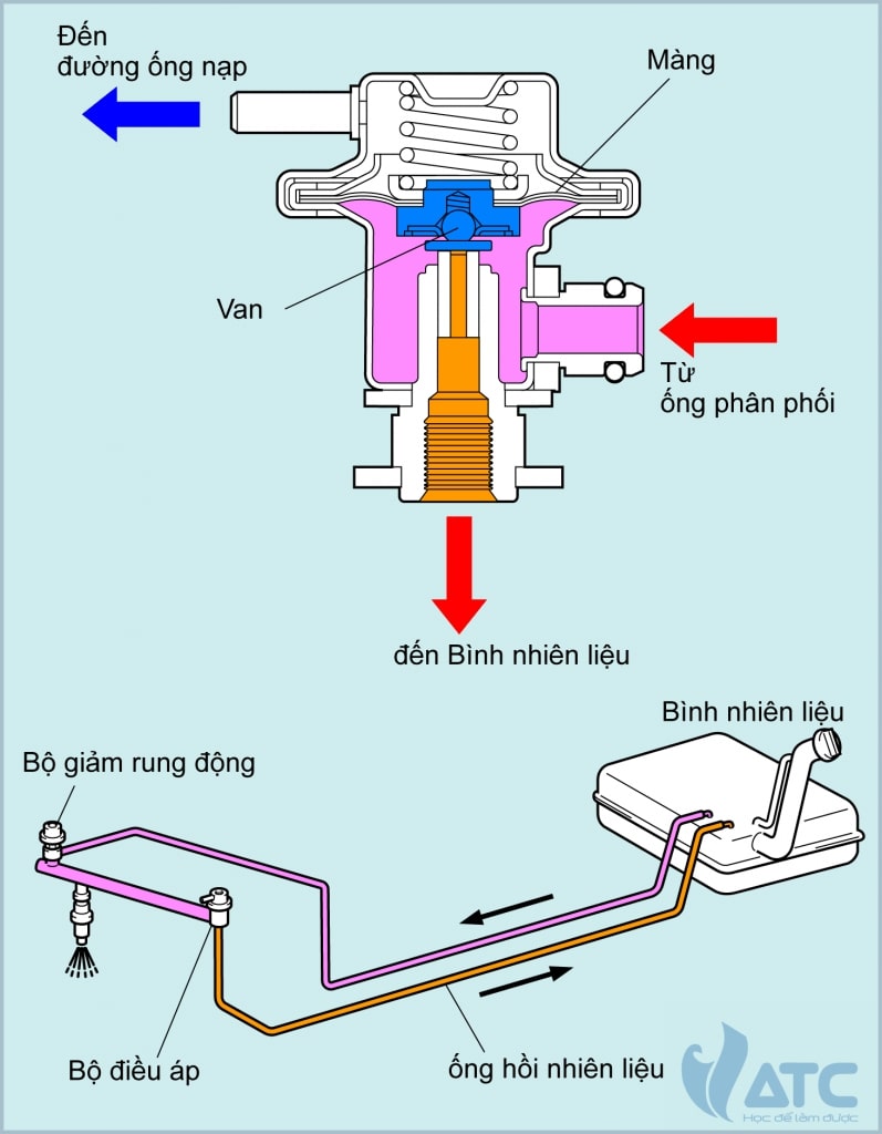 Áp suất nhiên liệu trong đường ống nhiên liệu phải được điều chỉnh để duy trì việc phun nhiên liệu ổn định bằng bộ điều áp và bộ giảm rung động.